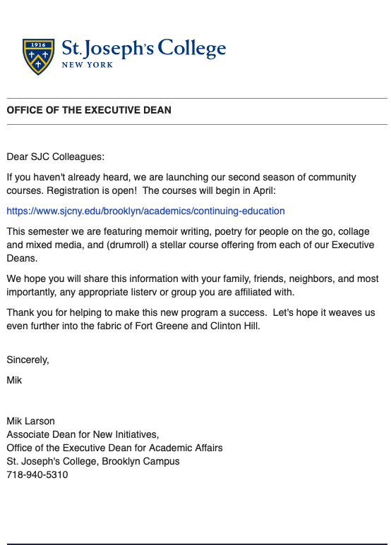 Community Courses at St Josephs by Suzanne DeBrango | Mar 9, 2019 | Announcements, Blog, Events | 0 comments Share this: Click to share on X (Opens in new window) X Click to share on Facebook (Opens in new window) Facebook Click to share on Pinterest (Opens in new window) Pinterest Click to email a link to a friend (Opens in new window) Email Click to print (Opens in new window) Print Submit a Comment Cancel replyYour email address will not be published. Required fields are marked *Comment * Name * Email * Website Notify me of follow-up comments by email. Notify me of new posts by email.